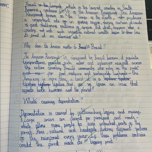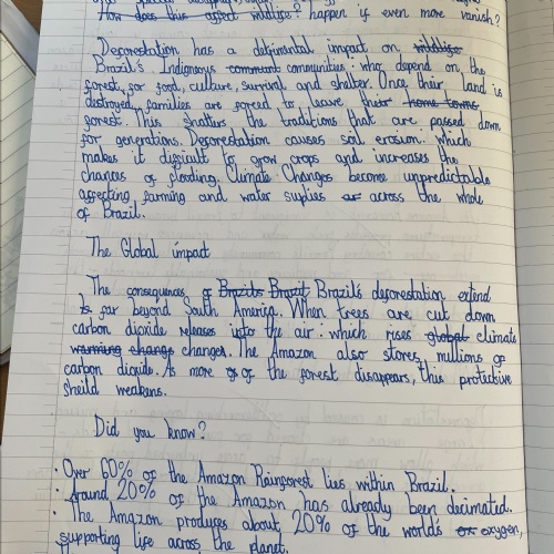 In Year 6, pupils learn about climate change through a study of the Amazon rainforest. They explore Brazil's role in the rainforest and the effects of deforestation on wildlife, people and the planet.