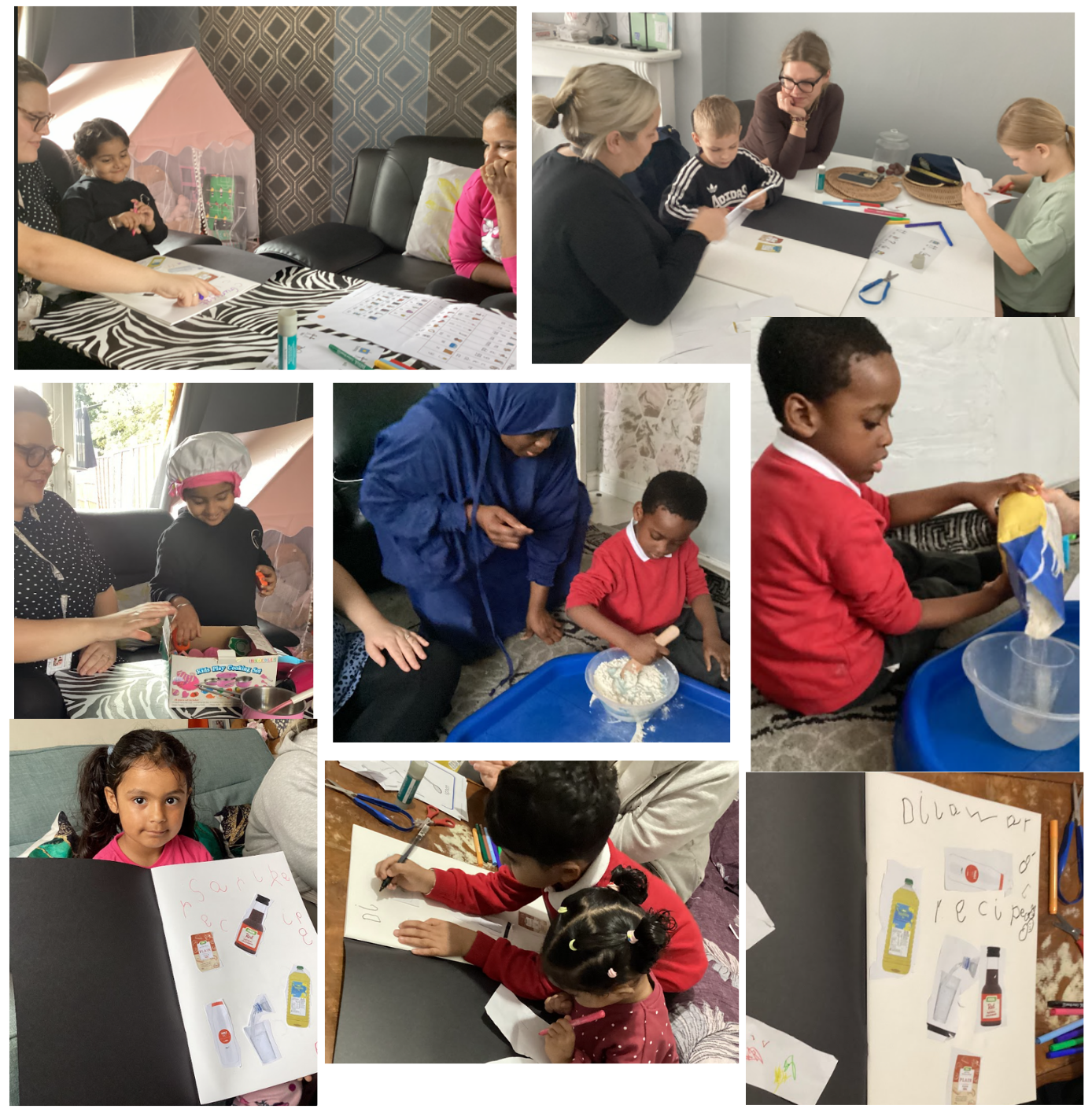 We have conducted our first round of home visits focused on engaging families in practical, play-based learning activities. During these visits, we supported parents and children in planning out a simple play dough recipe, including cutting and sticking images of ingredients and utensils. We provided each child with their own book to keep in their home to add their own creations to. They will bring their book along to the next REAL mid-point coffee morning to share their home learning.