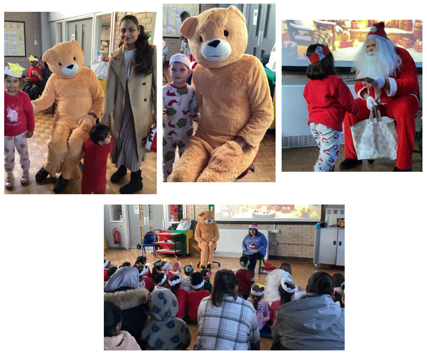 A Christmas Story Time event was held in the school hall. All children received a chocolate Santa lolly and a hot chocolate. Children, staff, and families attending the event wearing pyjamas. Anne from Great Bridge Library visited the school and opened the session by reading a story. Sandy Bear then participated in a meet-and-greet session, during which children had their photographs taken. Sandy Bear sat with Anne from the library while a story was read to the children.
